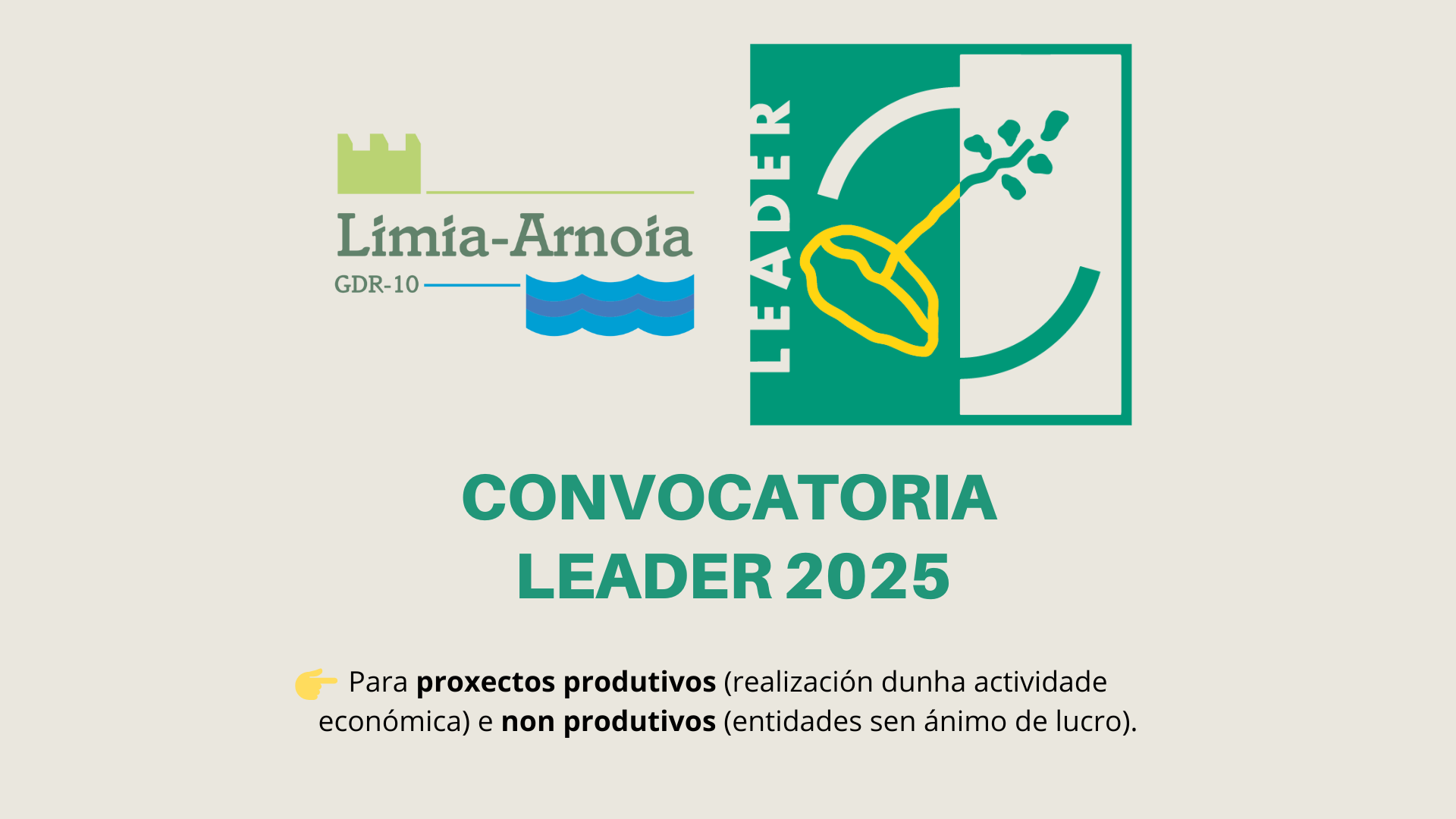 - Proxectos non produtivos: proxectos promovidos por entidades sen ánimo de lucro, entidades públicas locais, comunidades de montes veciñais en man común ou as súas mancomunidades, que non supoñan o inicio ou o desenvolvemento dunha actividade económica.