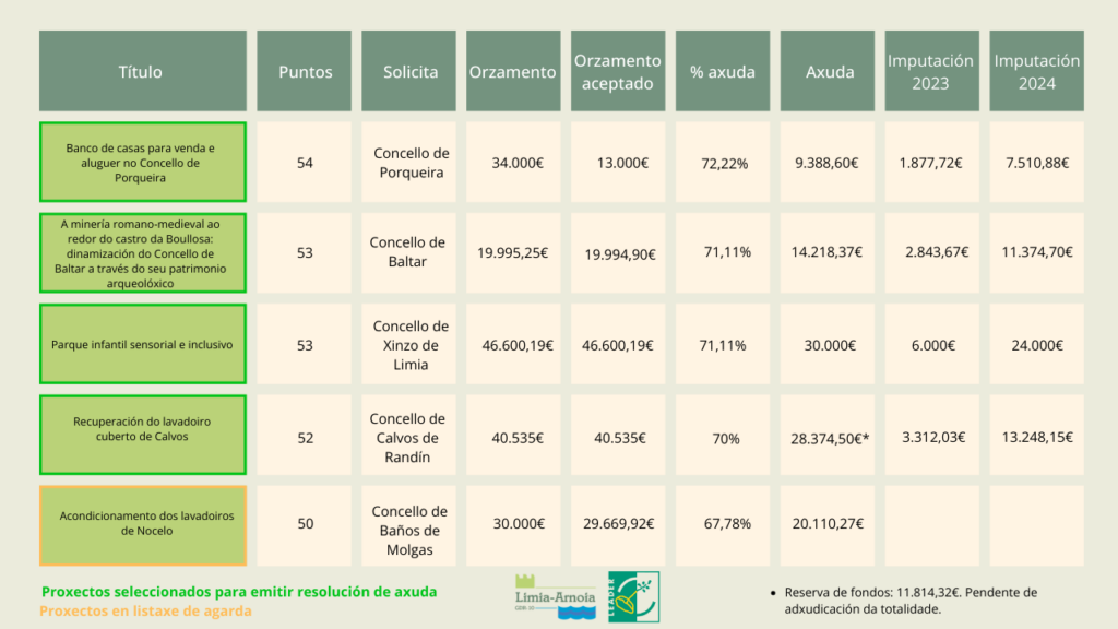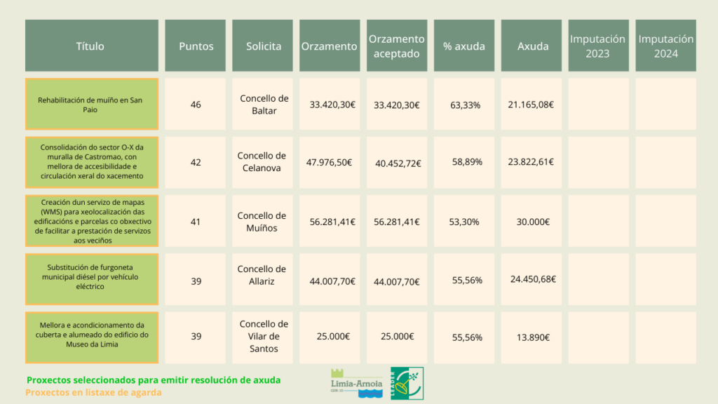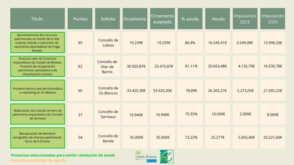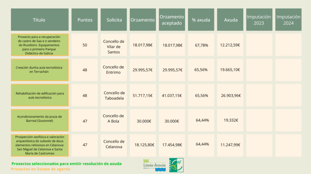 Os proxectos seleccionados para emitir resolución de axuda aparecen, a continuación, marcados en verde. En laranxa, os proxectos que están en listaxe de agarda.