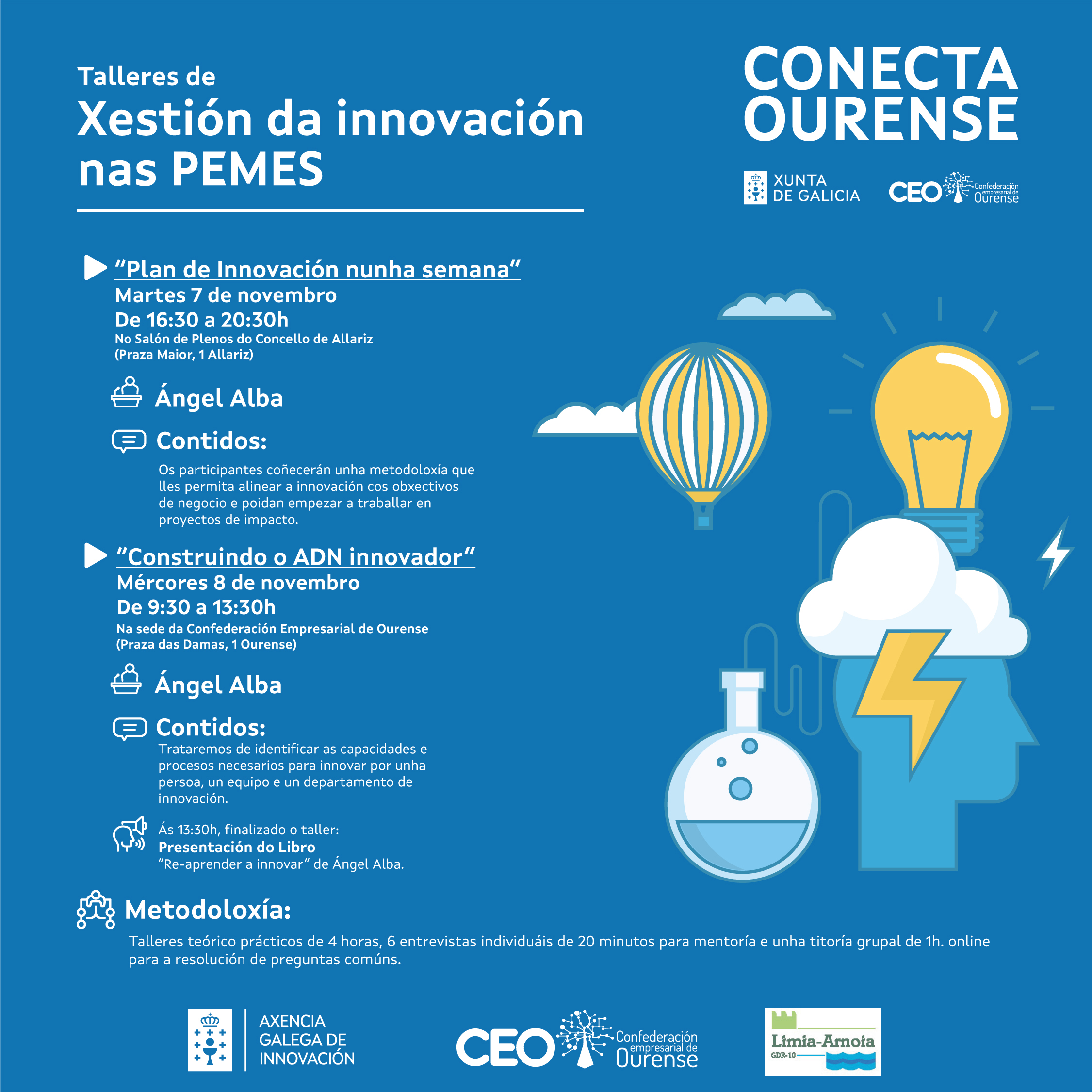 A Confederación Empresarial de Ourense e a Xunta de Galicia, a través da Axencia Galega de Innovación (GAIN), ofrecen un ciclo de dous talleres de “Xestión da innovación nas PEMES”, no marco da iniciativa Conecta Ourense e en colaboración co GDR 10 Limia-Arnoia.